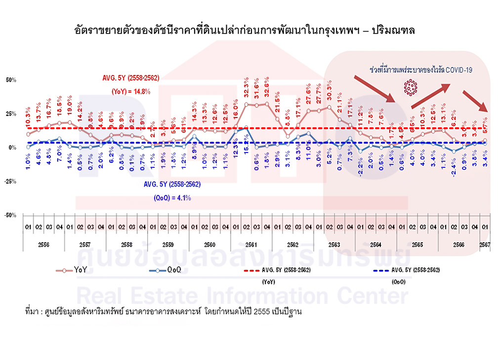 ศูนย์ข้อมูลอสังหาริมทรัพย์ ธนาคารอาคารสงเคราะห์ (REIC) รายงานดัชนีราคาที่ดินเปล่าก่อนการพัฒนา ในกรุงเทพฯ - ปริมณฑล ไตรมาส 1 ปี 2567 มีค่าดัชนีเท่ากับ 407.8 จุด เพิ่มขึ้นร้อยละ 5.7 เมื่อเทียบกับช่วงเวลาเดียวกันของปีก่อน (YoY) และเพิ่มขึ้นร้อยละ 3.5 เมื่อเทียบกับไตรมาสก่อนหน้า (QoQ) ซึ่งแสดงให้เห็นว่าราคาที่ดินเปล่าก่อนการพัฒนามีการปรับเพิ่มขึ้นอย่างต่อเนื่องในอัตราที่ต่ำกว่าการปรับเพิ่มขึ้นของอัตราค่าเฉลี่ย 5 ปี ในช่วงก่อนเกิดวิกฤต COVID-19 (ปี 2558 – 2562) ที่มีอัตราเฉลี่ยเพิ่มขึ้นร้อยละ 14.8 ต่อไตรมาส เมื่อเทียบกับช่วงเวลาเดียวกันของปีก่อน (YoY) และอัตราเฉลี่ยเพิ่มขึ้นร้อยละ 4.1 จากไตรมาสก่อนหน้า (QoQ) (ดูตารางที่ 1 และแผนภูมิที่ 1 – 2)