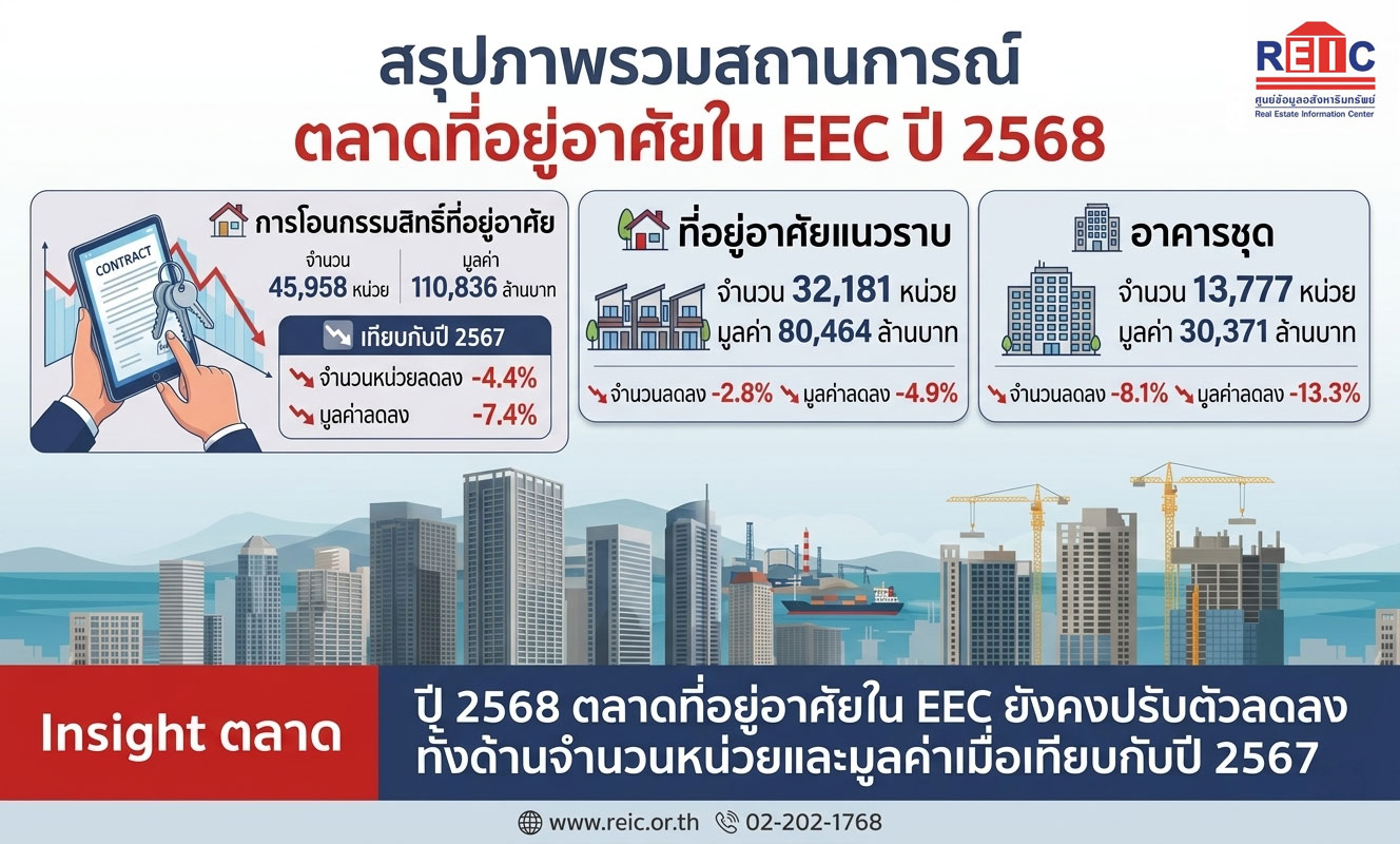 ศูนย์ข้อมูลอสังหาริมทรัพย์ (REIC) ธนาคารอาคารสงเคราะห์ (ธอส.) เปิดเผยผลการสำรวจภาพรวมตลาดที่อยู่อาศัย ในพื้นที่กรุงเทพฯ และ 5 จังหวัดปริมณฑล ประกอบด้วย กรุงเทพฯ นนทบุรี ปทุมธานี สมุทรปราการ สมุทรสาคร และนครปฐม โดยเป็นผลสำรวจในไตรมาส 4 ปี 2567 พบว่า อุปทานเสนอขายในตลาดที่อยู่อาศัยรวม (บ้านจัดสรรและ อาคารชุด) มีจำนวน 230,994 หน่วย ขยายตัวเพิ่มขึ้นร้อยละ 0.8 มูลค่า 1,441,910 ล้านบาท ขยายตัวเพิ่มขึ้น ร้อยละ 12.8 ตามลำดับ เมื่อเทียบกับช่วงเดียวกันของปีก่อน โดยส่วนหนึ่งมาจากโครงการที่อยู่อาศัยเปิดตัวใหม่ เข้ามาสู่ตลาด ณ ไตรมาส 4 จำนวน 17,153 หน่วย ลดลงร้อยละ -45.3 มูลค่า 137,882 ล้านบาท ลดลงร้อยละ -42.5 เมื่อเทียบกับช่วงเดียวกันของปีก่อน โดยเป็นการลดลงของการเปิดโครงการใหม่ประเภทโครงการบ้านจัดสรร โดยมีโครงการเปิดขายใหม่จำนวน 6,384 หน่วย ลดลงร้อยละ -59.5 มูลค่า 83,898 ลดลงร้อยละ -41.8 เป็นโครงการอาคารชุดจำนวน 10,769 หน่วย ลดลงร้อยละ- 30.9 มูลค่า 53,984 ลดลงร้อยละ -43.4...