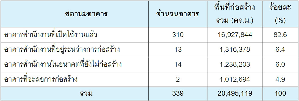 อาคารสำนักงานที่ยังไม่เปิดใช้งาน 29 อาคาร แบ่งเป็น อาคารที่อยู่ระหว่างการก่อสร้างจำนวน 13 อาคาร พื้นที่รวม 1,316,378 ตารางเมตร คิดเป็น 6.4% ของพื้นที่ก่อสร้างรวม เป็นอาคารในอนาคต ที่ยังไม่ก่อสร้าง มีจำนวน 14 อาคาร พื้นที่รวม 1,238,203 ตารางเมตร คิดเป็น 6.0% และอาคารที่ซะลอ การก่อสร้างมีจำนวน 2 อาคาร พื้นที่รวม 1,012,694 ตารางเมตร คิดเป็น 4.9% (รายละเอียดตามตารางที่ 1)
